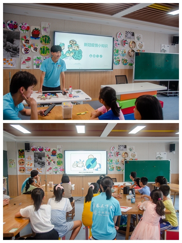 7月20日,实践团队前往严店乡中心学校进行防疫宣讲。成员们向小朋友们讲解新冠肺炎的危害和防护知识,并播放钟南山院士的纪录片,让小朋友们深入了解抗“疫”故事。