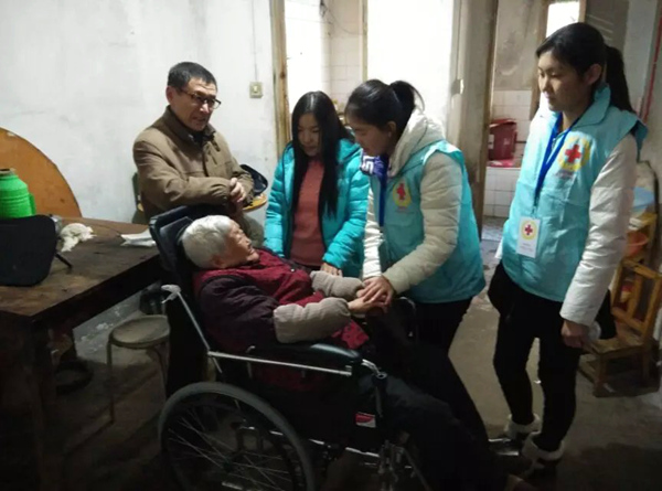 2016年1月4日,在志愿者社区工作2个月、充分了解社区居民实情的基础上,由我校红十字会会长蔡袁成带队,四名志愿者来到家庭情况困难的阮老太太家并赠送给了老太太一辆轮椅。老太太今年已是90高龄、腿脚不便,丈夫今年也89岁了、卧病不起多年,家里还有个智障儿子,家庭负担很重。老人很期待能有一辆轮椅解决平日出行难题。志愿者们了解了老人的心声,积极想办法,出对策,终于帮老人圆梦。老人的其他子女在谈及志愿者,言语中充满肯定,“现在流行点赞,我要给你们合肥学院大学生红十字会点赞、给你们志愿者点赞,合肥学院的志愿者们都是好样的”。
