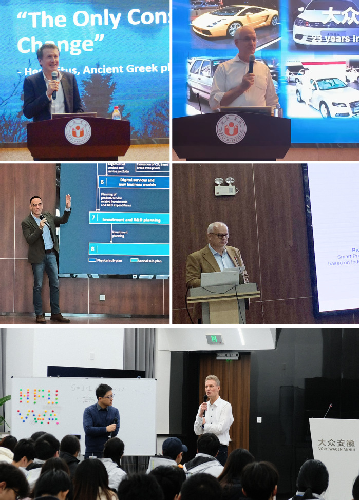 2023-2024学年第一学期,大众学院联合大众安徽举办了5次企业客座教授理论授课与认知实习活动。学校客座教授、大众安徽首席执行官葛皖镝博士、首席财务官哈约根博士、首席技术官吕尔曼博士、首席数字官高乐夫先生和首席制造官施耐德先生,为学生进行精彩授课。